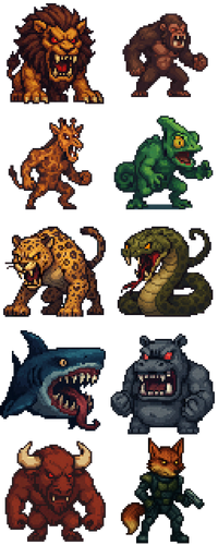 - All animals are represented in a monster variation for use as enemies, bosses, or unique characters.