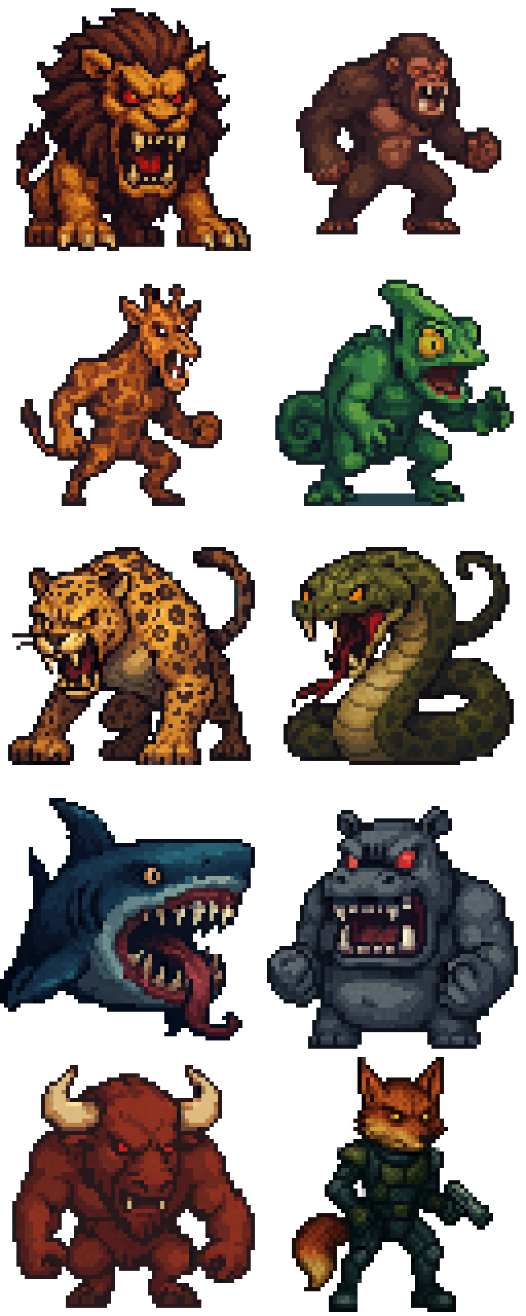 This asset pack contains 10 wild animals in monster form designed in 64x64 pixel art. Each sprite is detailed and created for use in 2D games.
